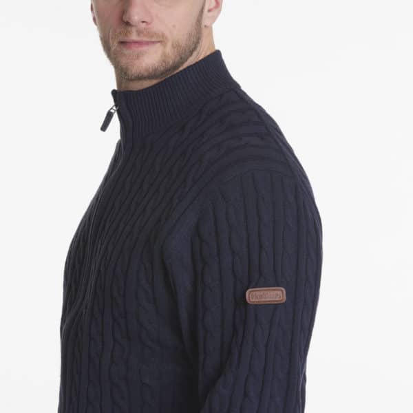 Le « Cardigan à torsades » se distingue par sa fermeture à glissière, son patch sur le bras et son tricot à côtes au bout des manches et en bas. Il est confectionné en maille CYCLO, un mélange de coton recyclé et de polyester, faisant de ce produit une option durable qui préserve l’environnement.