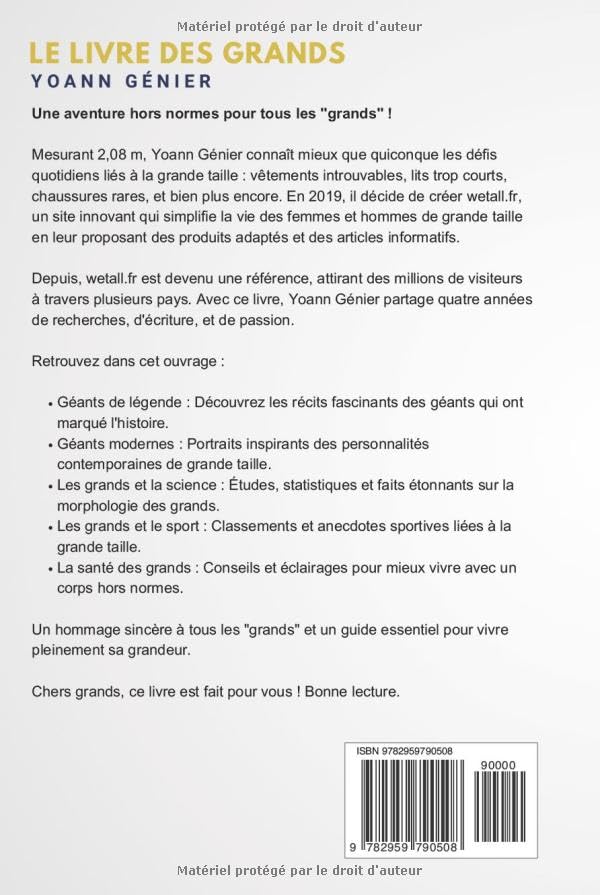 Dans Le Livre des Grands, Yoann Génier partage son vécu et ses enquêtes sur la grande taille. On y découvre :